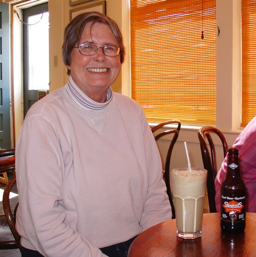 Mary was the only one of the three of us to order something cool to quaff. It came in the form of a root beer float made with genuine Stewart's root beer. None of us had actually ever heard of Stewart's root beer but the bottle was embossed and looked quite nice and that's really all the reason the KlatschMeister needs to take another picture. Mary looked quite nice as well, but she did not appear to be embossed. |