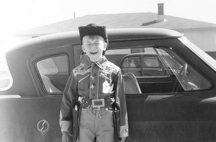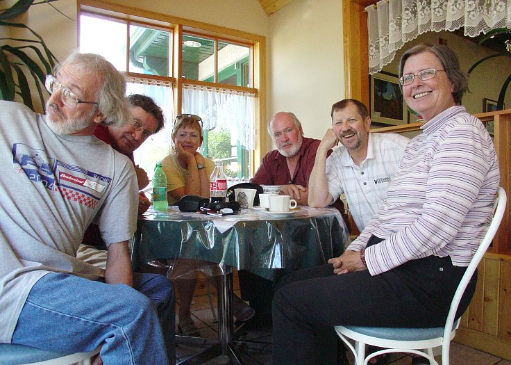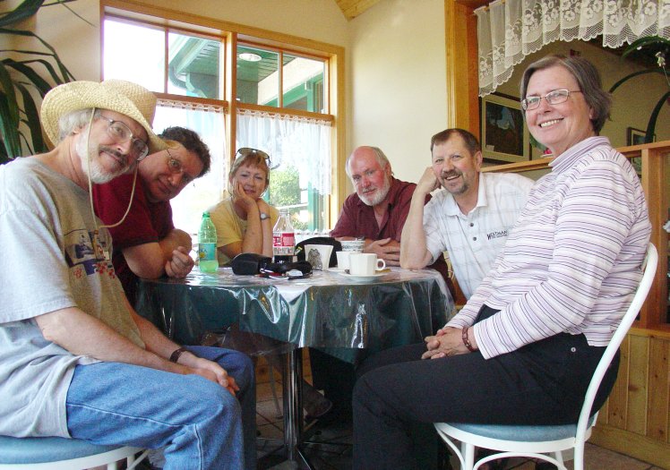 Is there any better place to be in Calgary during Stampede Week than Edelweiss Village? Klatschers say neigh. This week's Klatsch features an unexpected guest; that's him wriggling in his seat on the left. Unexpected, you say? That's the same old idiot who always shows up in these pics. Right, but he was supposed to be halfway between Spokane and Boise at about this time. However, his transmission decided it had had enuff a few minutes down the TransCanada highway on Monday morning. His small red car having been rendered close to undrivable, the Krysaks kindly offered to ferry him to the Klatsch, so here he is. He's twisting around like that because he had forgotten to put on the nice cowboy hat which Big Walt had just given him. No pic without the hat, said he. So, here he is, hatted... This is actually the first cowboy hat he has owned since he was a wee lad. There are some pics of him with his other cowbody hat around someplace. Found 'em!... Here's a closer look... |