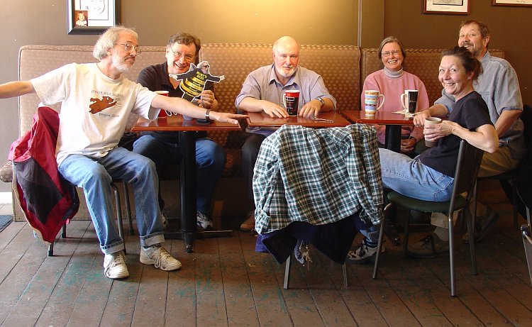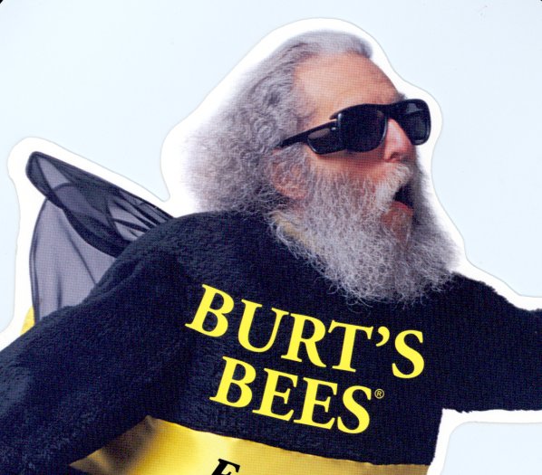 A new face at the Klatsch. Please join us in welcoming Judy McCaull (2nd from right). Jude worked down in Mr. T's branch plant operation over at the Tech for many years and is now in the flower department at Costco. Over on the other extreme, Big Walt dangles a Burt's Bees mobile he spotted whilst on vacation in the Excited States of America. He found the proprietress of the shop, told her he knew a guy in Canada who looks just like Burt and proceeded to talk her into giving him the mobile so he could bring it home. He presented it to the KlatschMeister at the Klatsch today and I have to say, I am tickled pink. Here's what Burt looks like up close and personal... |