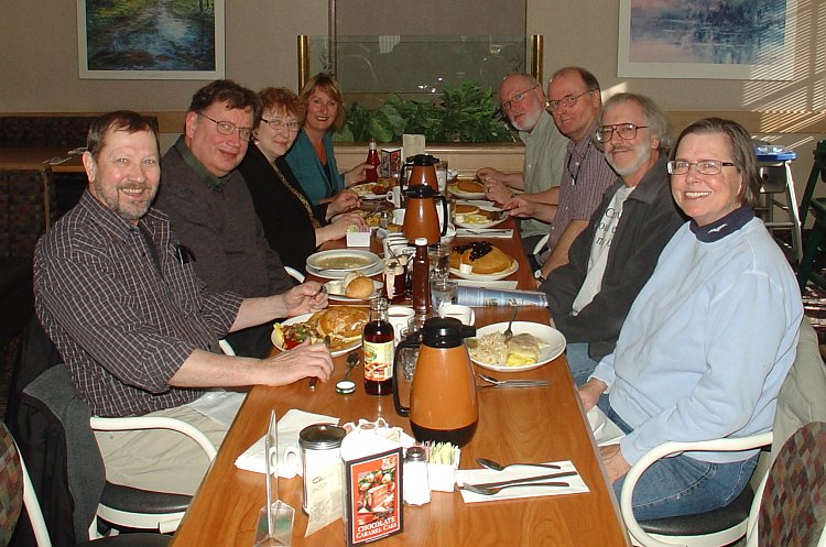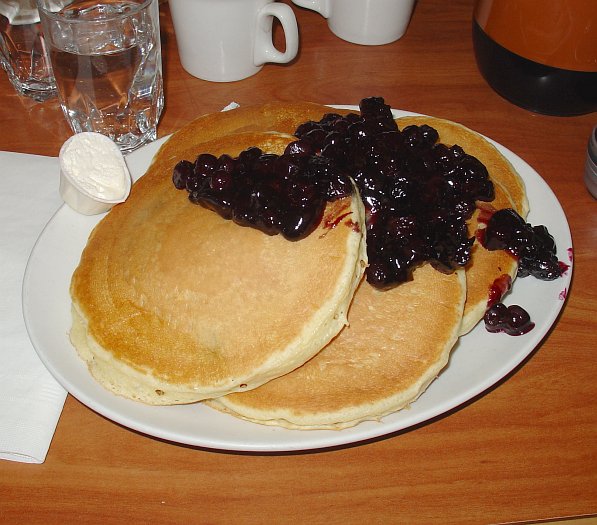 Shrove Wednesday came early this year and, in a first ever event, the KlatschMeister managed to schedule our annual trek to Dr. Tongue's 3D House of Pancakes all by himself. Just a fluke, probably. Sheil rounded up Linda and Digby and brought them down to join our merry band. The KlatschMeister ordered the "full stack" of blueberry pancakes but, as the old saying goes, his eyes were bigger than his stomach (hard to believe if you've seen his stomach lately) and, despite his best efforts, was unable to finish them all. Here's what they looked like when they arrived... |