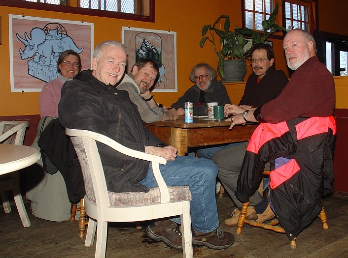 A nice day at Weeds Cappuccino Bar. And nice to see infrequent attendees Terry and George. The only thing that sticks in the KlatschMeister's rapidly degenerating mind about this particular Klatsch is Terry's vivid retelling of a number of hair-raising automotive misadventures which had befallen him of late. So, drive safely kids and watch out for the other guy! |