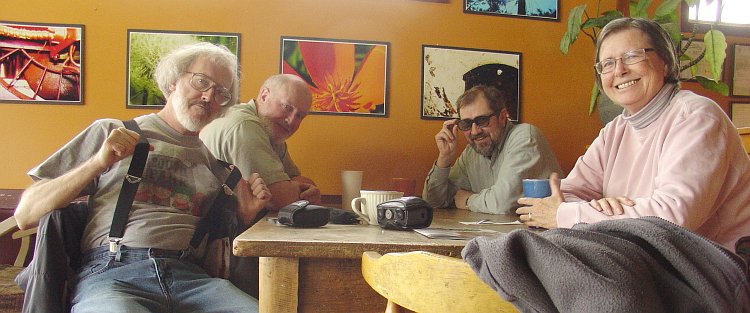 Here we are at Weeds on quite a chilly day in late April. Those shades Lawrence is sporting are, in fact, not shades but 3-D glasses the KlatschMeister got at the movie U23D. U23D is a concert film shot using one of the new digital 3D technologies. On the left where there appears to be an old gray-haired geezer snapping his suspenders is, in fact, an old gray-haired geezer snapping his suspenders. The KlatschMeister doesn't like wearing a belt right now cuz it rubs his incision the wrong way so he's tryng out this alternate method of keeping pants from falling down. So far he likes it. Under discussion (apart from 3D and suspenders) was Darwin's theory of evolution and how it could cause a bird's eggs to change color so that they blend in better with the environment. The concensus seems to have been that mutation was at the nub of it. |