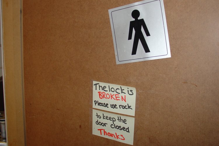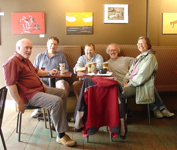 A nice summertime Klatsch at Central Blends, the first one there this year -- and the year's half over! What the hell is goin' on with time, lately? Those who have been keepin' up with the comings and goings will remember that Bob has written a book and this week he announced that it is being published by an offshoot of Amazon called BookSurge. There are a few legal loopholes to deal with -- like making sure the American I.R.S. doesn't swoop down and scoop all of the profits before they have a chance to make it back across the border -- but the whole process seems pretty streamlined especially compared to the more traditional publishing houses. Stay tuned. On his way out, The Mayor decided to hit the can, as is his custom. When he arrived he was greeted by this sign on the door so, of course, he took a pic... |