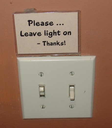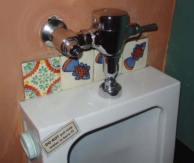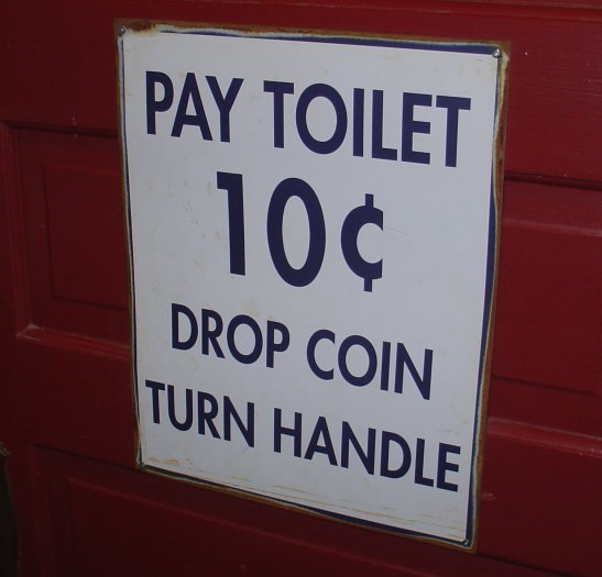 here. Hizzoner also wondered out loud why it takes more gas to run a car's air conditioner. His thinking is if the car's air conditioner is run by electricity and the car is making that electricity anyway (via the alternator) the air conditioning should be free. Bob's theory (which I can't remember now, cuz it was, like two hours ago or something) seemed to make sense but I'm still wondering. I have made a mental note to ask Danny when I see him. That "make a mental note" thing always works. Mary took a short break and reported back that the lady's room has a sign in it encouraging patrons to drop a dime and turn a handle to use the facilities. She wondered if the gent's also has such a sign. Well, the gent's is chock-a-block with signs. Check 'em out...