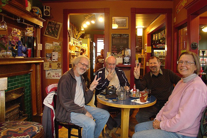 Here we are at Kaffa Coffee House in Marda Loop. I think this is the first snowy-day Klatsch of the autumn. Knowing that there is nothing which warms the KlatschMeister's cockles quite as much as a camera, Bob brought along his new Nikon D700 to show us. The KM very approved of the D700's relatively low magapixel count and excellent high ISO performance. It also sports lots of buttons which means less digging around in menus. A good choice, overall. Another thing which warms the KlatschMeister's cockles is world peace (not as much as cameras, but quite a bit). That explains all the peace signs; we anticipate that U.S. President Elect Barack Obama will make inroads in that area. Fingers crossed, too. |