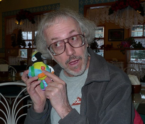 Today we welcome a new member to the Klatsch: Sheila Donaldson. Sheil packed it in at the Tech just before Christmas and this is her first Klatsch as an official retiree. Congrats, Sheil. Hope you'll make it a habit to stop by on Klatsch day. Sheil and Gerry have just bought themselves a vacation home in Phoenix and on the way back from there after Christmas they stopped in Vegas long enuff to purchase this little souvenir for the KlatschMeister, Polly, the insult parrot. Polly's outbursts are not repeatable in an all-ages album but she definitely isn't shy about expressing her thoughts...