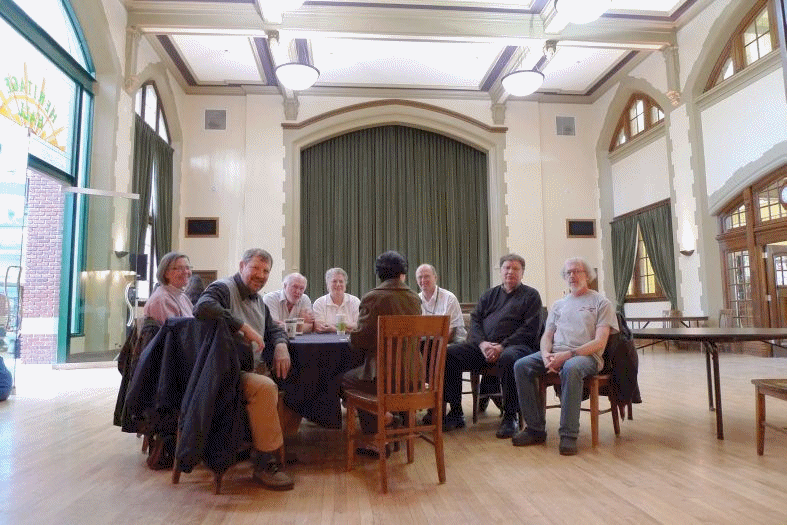 They were having some sort of job fair or something in the atrium when we descended upon The Polly Technique for our Kaffee Klatsch so we repaired to the vaulted grandeur of the old auditorium and quaffed our bevvies there. The KlatschMeister took two shots cuz May was pointing in the wrong direction for the first one. It all worked out in the end though; the two shots combined quite well to create one of the thoze krazy Klatsch animations that are so wildly popular we can't keep them in stock, like pancakes. |