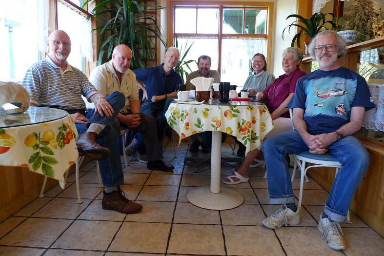 It was a two Kennys Klatsch at Edelweiss Village, today. Our ol' pal and fellow workabilly from the Tech, Ken Watson, was in town to attend his granddaughter's high school graduation and he swung by for a cuppa with us on the afternoon of the day before the big event. Kenny reports all is well back home in Ontario where he now lives. He's still painting away like mad but now caters to the local taste for Ontario scenics and landscapes rather than the Kananaskis, mountain and prairie subjects he painted when he lived out here. If you'd like to take a look at some of Ken's work, his Web site is here. And, by the way, if you're thinking the other Kennie looks a bit better than he usually does in these Klatsch photos, that's because he's sporting the nice T-shirt that Kenny brought him from the Royal Canadian Air Force Museum in Trenton. Thnax, Kenny! It's great! |