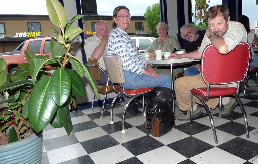 Here we are at Cadence Coffee and, yes, once again, I have left it too long and can't remember what transpired. But I do remember this, the shot was set up so that the stuff through the window would be properly exposed just like the stuff inside Cadence. Trouble is, there's really nothing through the window worth lookin' at. Another thing about this week's shot is that it is orphaned between two non-Klatsch shots. Last week the KlatschMeister was missing in action and next week is the spring SAIT's Alive BBQ (instead of bunch of grinning retirees look for a close-up of naked meat or something equally off-putting). Two weeks hence, who knows what fortune will bring our way. I dasn't even think about it. |