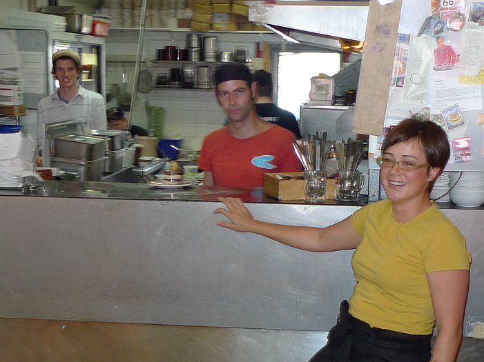 Then, a little while later, yet another photo op. Strains of Happy Birthday could be heard pealing through Diner DeLuxe and of course, everybody looked to see who was being embarrassed in public this time. Lo and behold (faith a begorra) it turned out to be one of the Diner DeLuxe staffers. Now, the KlatschMeister is not as sharp of wit or fleet of foot as he thinks he once was and by the time he got over to where the action was, the action had already been. However, the birthday lad and one of his well-wishers stuck around for a photo, so thnax to them for that and, from all of us at the Kaffee Klatsch: Happy Birthday, Man!