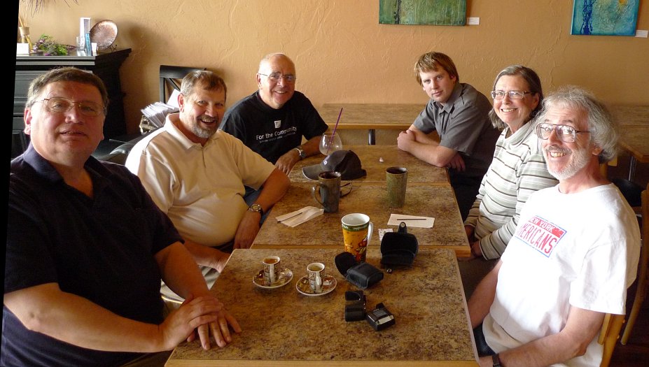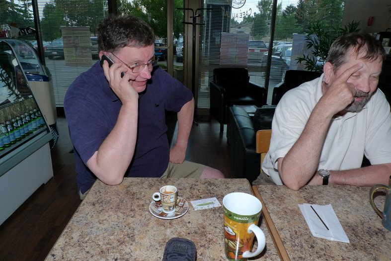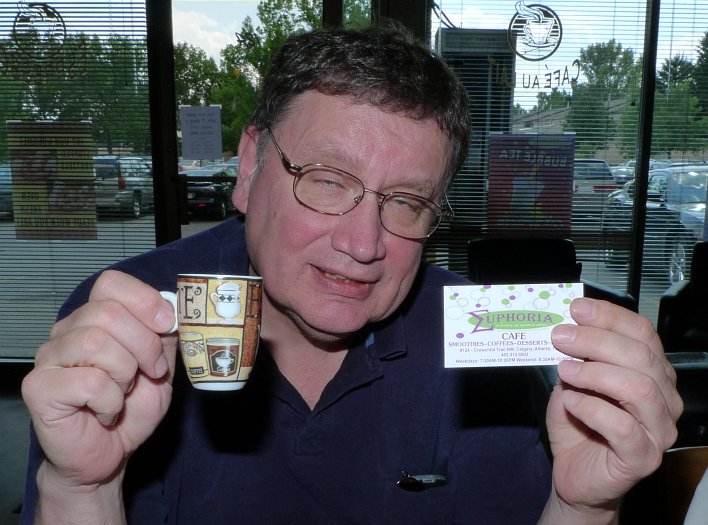 Well, no sooner had the KlatschMeister dispatched the weekly Klatsch Notice telling everyone that the Klatsch would be held at Full o' Beans than Moe, who is working in the neighborhood, let him know that Full o' Beans is no more. The establishment is still there, but is now called the Euphoria Cafe. Same great coffee, new name. And along with that new name, a new attendee, Paul's son, Paul's son, Paul's trout, Dan Krysak dropped by for a smoothy to see how the walking dead spend their last few moments on this mortal coil. Well, this is how. One thing the Euphoria Cafe does that I don't recall seeing in the other java joints (in Mexico it's pronounced havva hoints) we frequent... |
