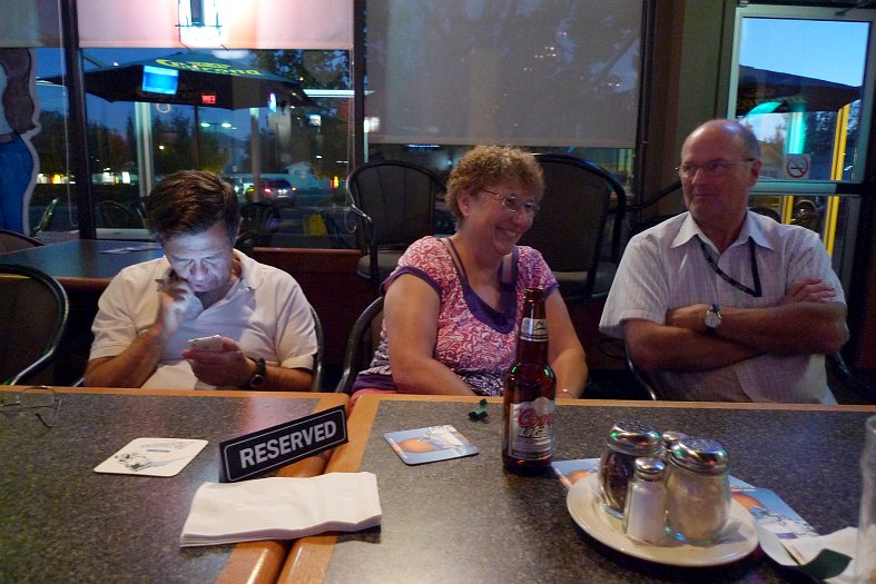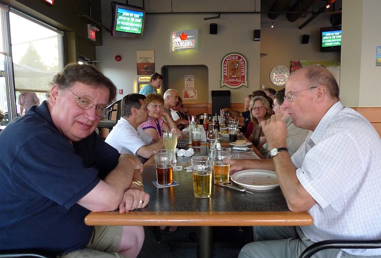 Gerry is still much enamoured of his iPhone. The ghostly presence on the left is him (and it). A few minutes earlier we egged him on to try one of the apps he has loaded on his iPhone. The app is designed to identify songs just by listening to them. Sounds a bit far-fetched, I know. But here's how it went: The pub was noisy -- there were loud conversations going on all around, there were sports events blaring from the TVs, and there was a song playing on the juke box. Gerry started the song identification app going on the iPhone, held the iPhone up over his head for about five seconds and when he brought it down the name of the artist, George Michael, and the name of the song he was singing were displayed on the iPhone's screen. When Gerry read out the song title someone at the table recognized it and said it was correct. Now that is impressive. Big Walt said his Dad and some of his friends use a similar iPhone app to identify bird songs at their condo. It truly is an amazing age we live in. |