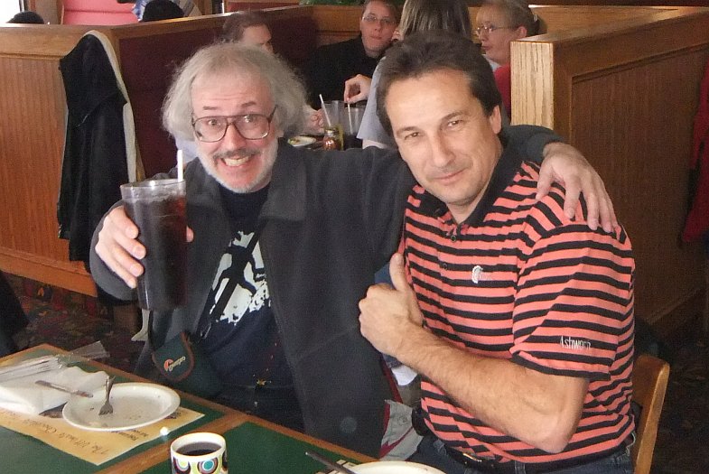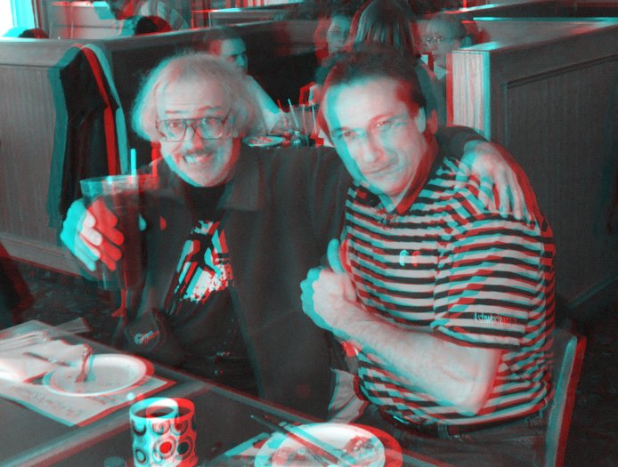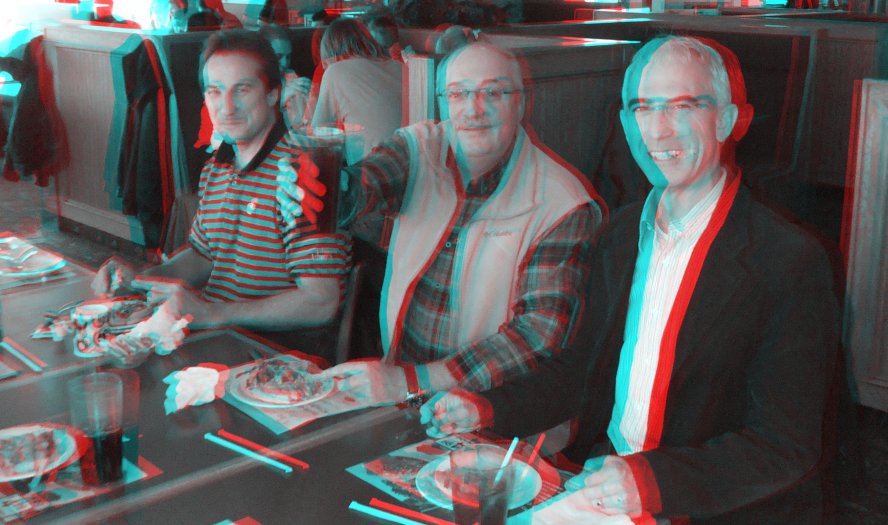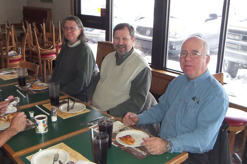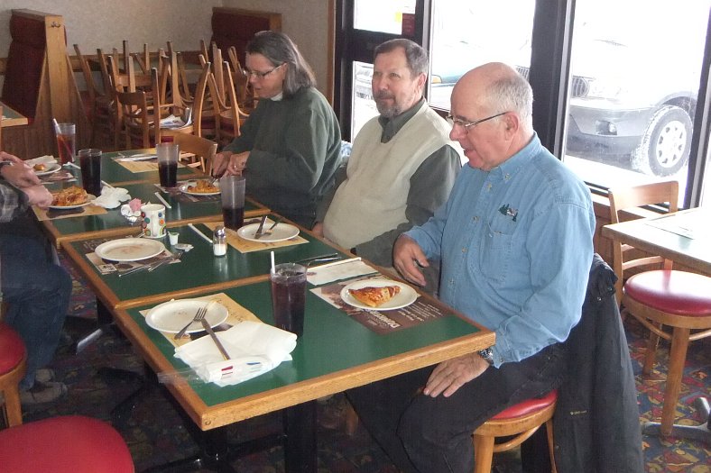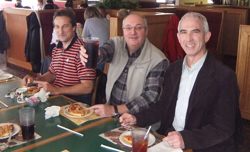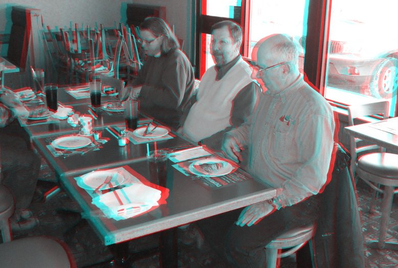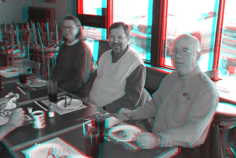 Dan, Dan, the Macheesmo Man and the KlatschMeister enjoying a moment of levity at the Brentwood Pizza Hut. Dan, Dan suggested we hit the lunchtime buffet so we could try Pizza Hut's new offering, the candy cane and Gouda cheese pizza. Well, we waited and waited but it never did show up. Ah, well, maybe next year. In addition to the usual suspects, we were glad to see Moe, Odo and Bazooka Joe. Conversations covered the big snow dump, flu shots, various new building materials you can get theze daze and why the water level in El Klatscho's commode goes down when it's really windy out. Odo and Digby recently returned from Florida where they were gator huntin' and Shuttle spottin'. Soundz like more fun than snow diggin' here in cowtown. There are a few more pics and their 3D versions below...