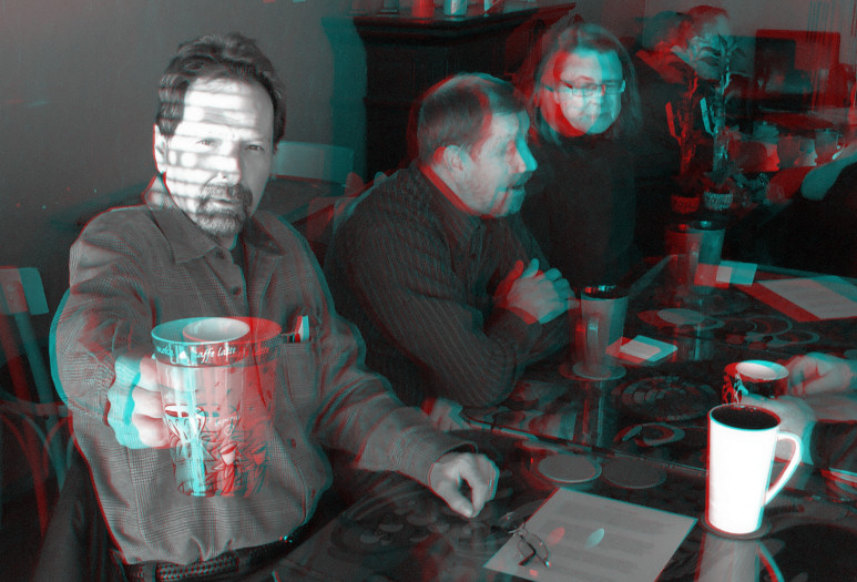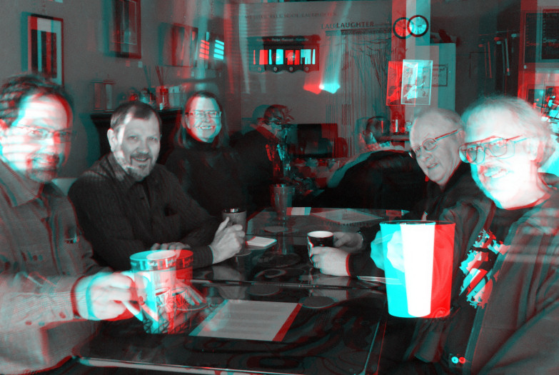 Here we are, in Stupefying 3D, kicking off the New Year euphorically (if not metaphorically -- no actual kicking was involved) at the Euphoria Cafe. Terry Smith, late of the library up at The Tech stopped by for a cuppa and Doug, still recuperating from a harried season of Christmas Tree sales, took a breather before plunging headlong into the wild and wooly world of bed 'n' breakfast running in Banff. Everybody survived Christmas -- each year it gets more difficult, seems like -- and it was good to settle into the old routine. This year most of the Klatsch pics will likely be in 3D (no 2D version) so if you need 3D specs, the best way to get a free pair is to show up at a Klatsch. Hope to see y'all soon!