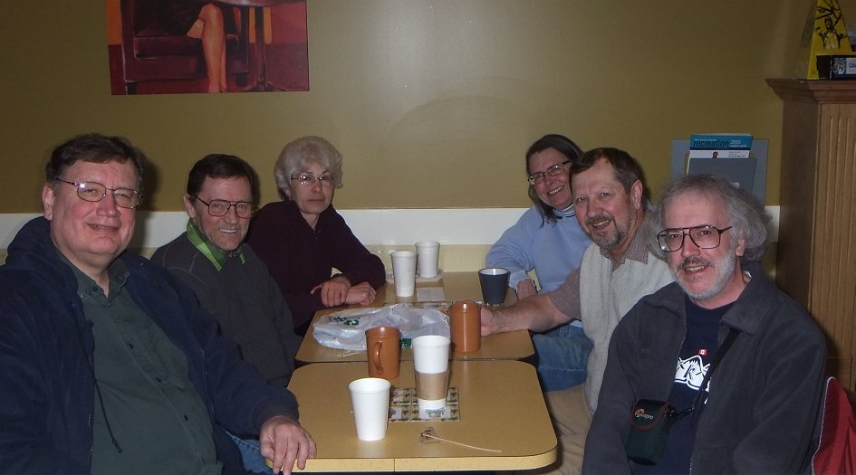 Well, it felt a lot more like a fall day than a spring day today, but the warm and friendly atmosphere in Cafe Le Matin made up for it. We disparaged Ann Coulter for being, well, what she is. The KlatschMeister related amusing stories from an interview with Jackie Gleason he's reading in an old copy of Playboy magazine he got from Mr. T. Big W talked about going to weddings in Saskatchewan (they were good because you got to drink and sometimes got a peck on the cheek). Ronald recalled how he invented bleached prints back in the daze of wet darkrooms. And later Lawrence and Mary and El Klatscho got down to business simplifying the English language. It'll be big job but at least it's started, now.