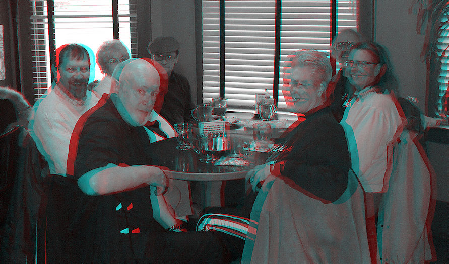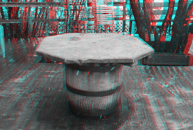 The Klatschographer tried a 3D shot through the window but it didn't work -- too many reflections. However, while he was outside he took a quick pic of one of the tables. It was snowing a little bit and you can see a couple of the big snowflakes streaking through the air in the front. It doesn't take much to keep El Klatscho entertained -- he is old and he is losing his mind. |