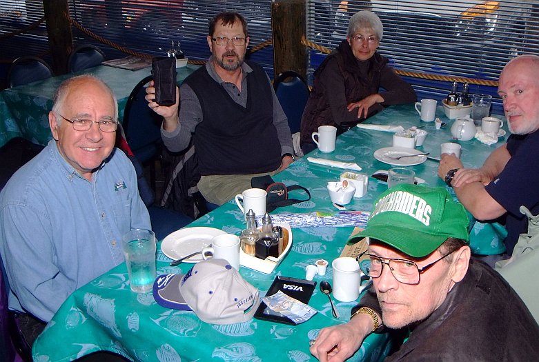 It was a wet one today, kids, but eight of us braved the deluge anyway and showed up at Pelican Pier for a cuppa. Moe is just back from a trip to England and Scotland and had wild and wooly tales of scotch samplings in the highlands, the lowlands and all the lands in between, probably. Poor Lawrence and Mary are still in revovation hell trying to outfox a window installer who may or may not be responsible for a leak inside a wall which must be fixed before new flooring is installed. At least they don't live in the Gulf of Mexico.
