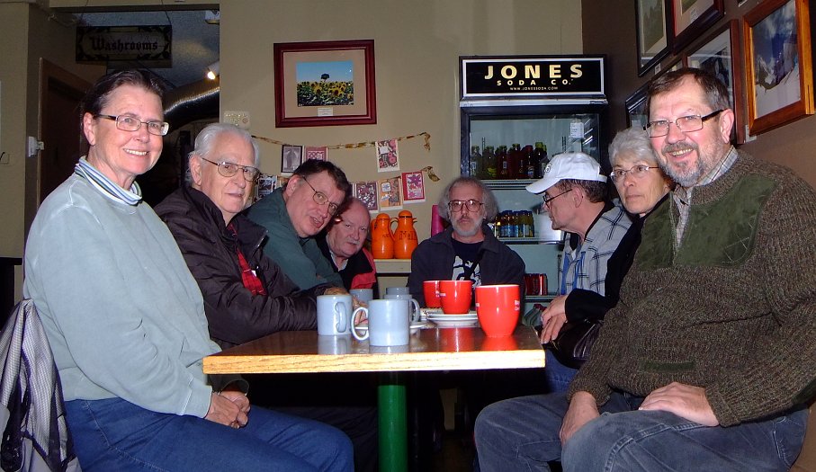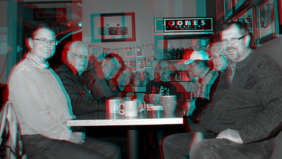 There was definitely an autumn chill in the air today as we converged, like so many caffeine predators, on Central Blends. Big Walt is back from his second trip to Butte, Montana. Duggy has (I think) shut down his Bed 'n' Breakfast in Banff for another season. Don is off to the craft sales offering his hand-made gem-stone jewellery for sale at bargain prices. As for the rest of our motley crew, I think it's same old, same old. But I could be wrong; I often am. Here we are in stupefying 3-D...