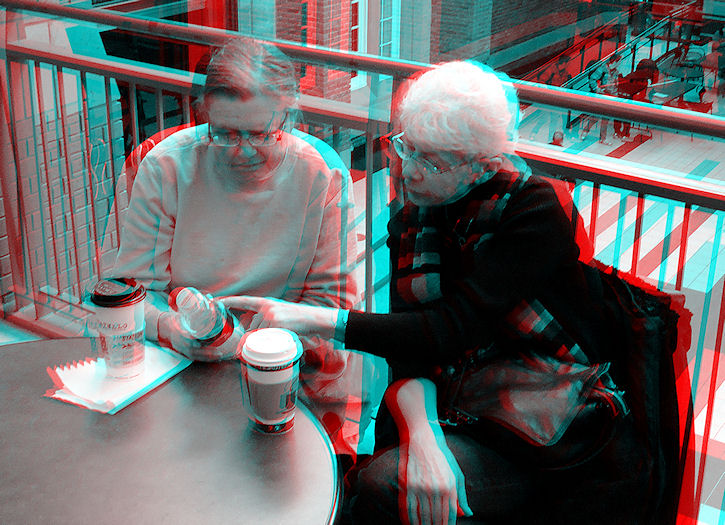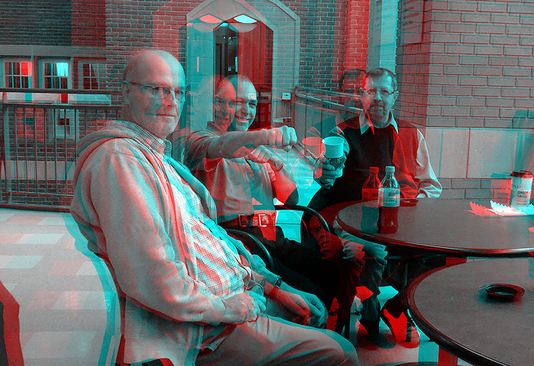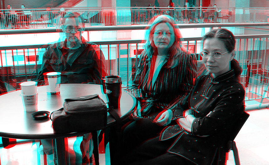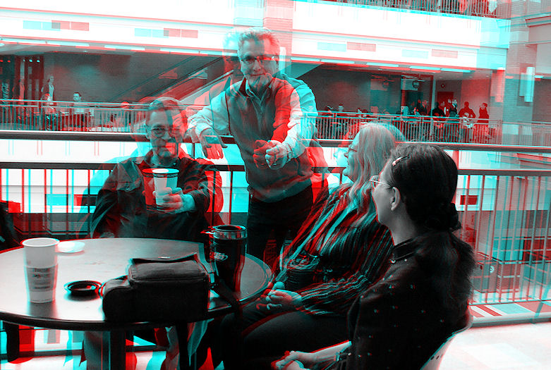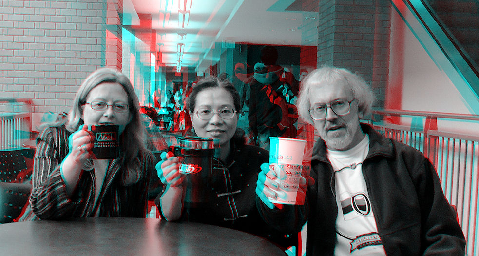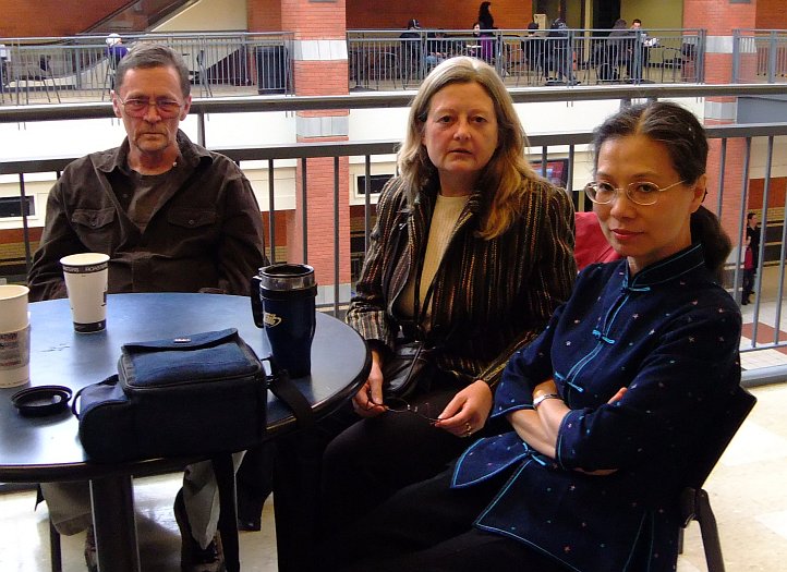 Here we are, back at the Tech again in search of covered parking cuz of all the snow. The Tech was preparing for its annual open house so the main floor of the Atrium was all cleared out with nowhere to sit, so here we are up on the second-tier. It was actually pretty good. Nice that Chee and Sarah were able to take a few minutes of their bizee daze to have a chinwag with us.