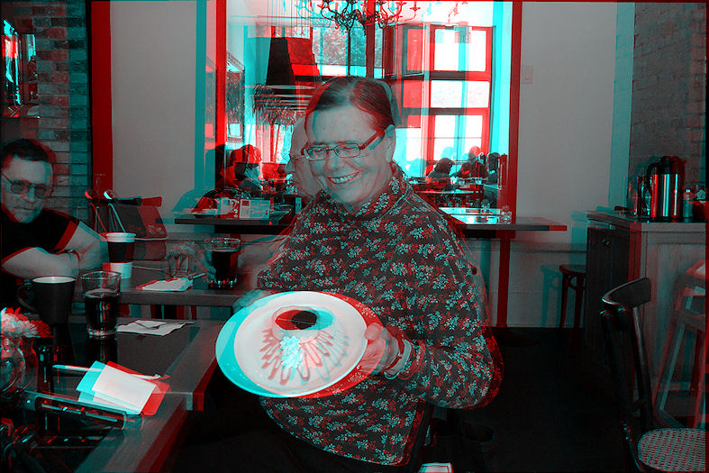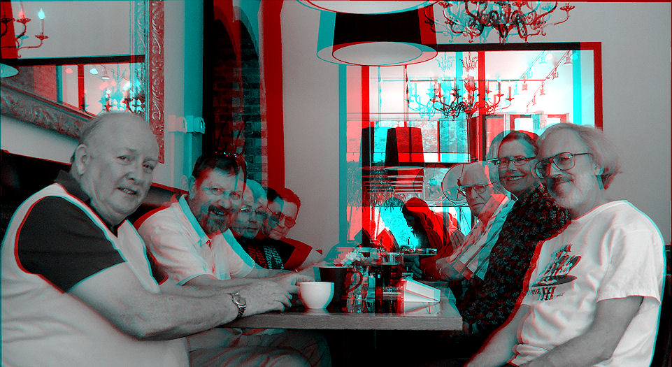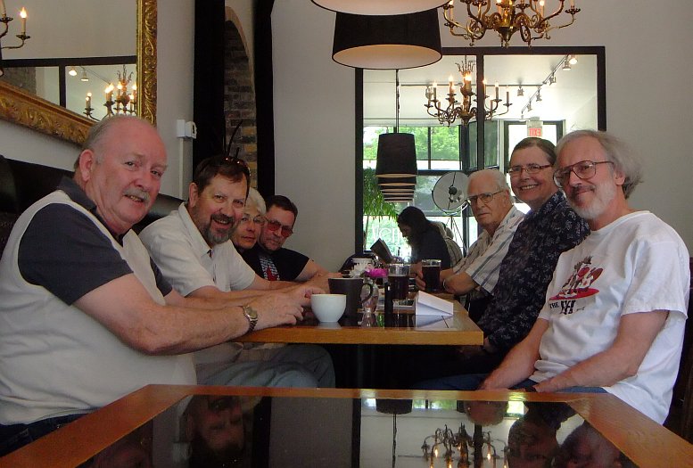Here we are in a place we've been to many times before but in a place we've never been. Before you give yourself a cerebral hemorrhage trying to figure that one out, we are in the new air conditioned room at the Vendome Cafe. The new room used to be some sort of high-end toy store or something but now is a very nice extension to the Vendome. Douglas took a break from being a bed 'n' breakfast host to set a spell and have a java in the air conditioned comfort of the Vendome's annex while Lorne and the Klatschinator sported their Canada Day regalia.