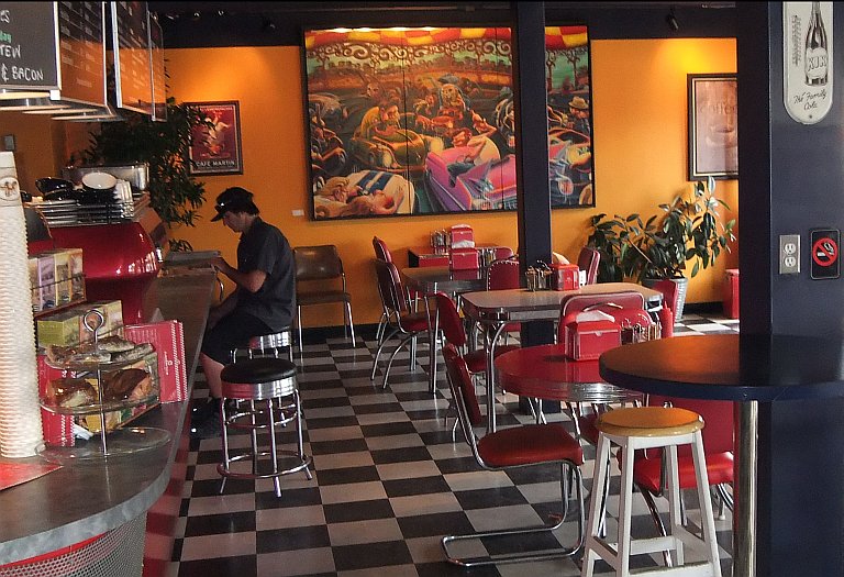 This might be a first: a shot of the Klatsch venue with nary a Klatscher to be found. The KlatschMeister was hangin' about up at the counter, waitin' for his cuppa, and he just thought the interior of the place looked nice, so he grabbed this shot. Turned out real purty, even if he does say so hizself.