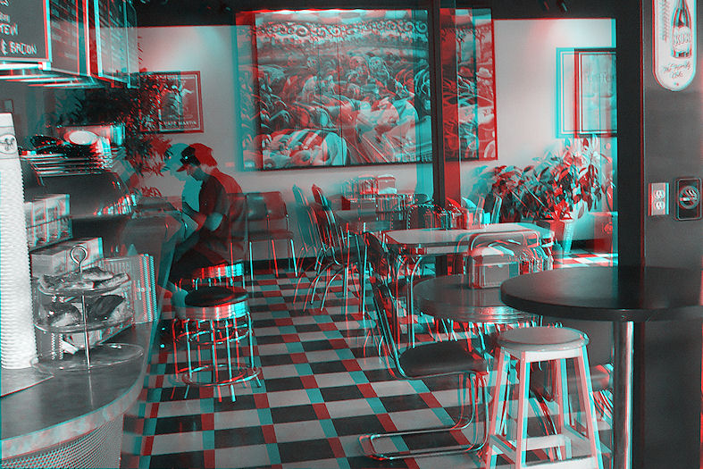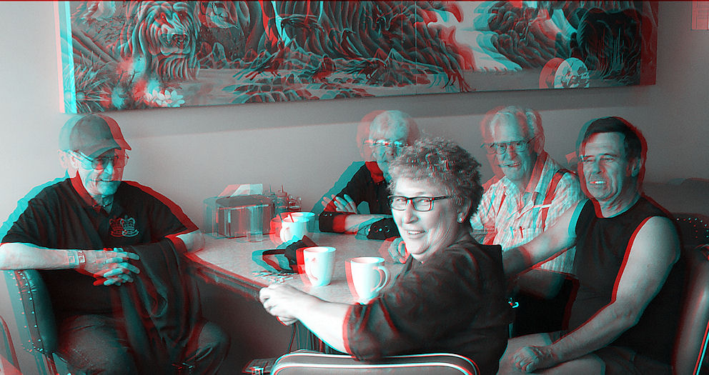 For the group shot, El Klatscho went outside and shot through the little side window by the doorway. Tons of weird reflections but this one turned out pretty good. Sheil had just got done shooting the shooter as he bumbled and fumbled around on the other side of the glass. Now that she's got her own 3D camera there's no stopping her. And that's just the way it should be!