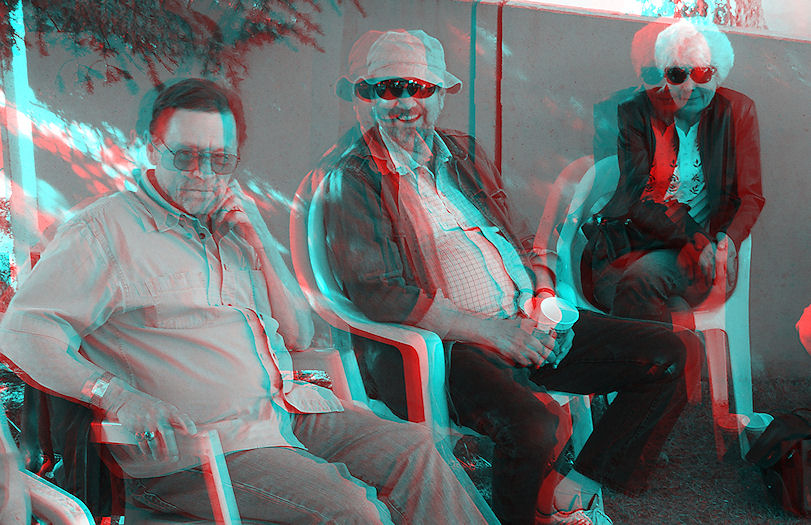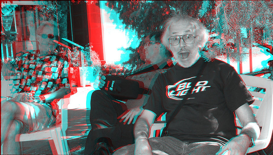 This fellow was riding by on his recumbent bicycle on his way to pick up a bevvy at Angel's and was nice enuff to show us his bike and explain some it's clever and intricate workings. For example: it has disk brakes, self-sealing tires and a little cartridge of compressed air about 2 1/2 inches long which will re-fill two flats, tilt handlebars for easy mounting and dismounting, an electronic speedometer, GPS and cell phone, a nice soft seat with an inflatable back rest and a great many gears which are all useful -- i.e. shifting up or down one gear makes a meaningful difference to how hard (or easy) it is to peddle.