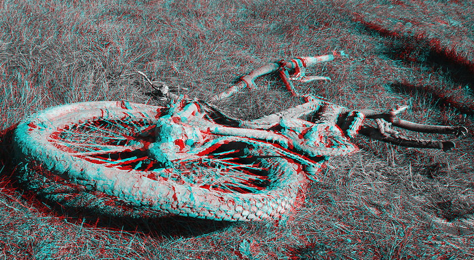 This poor old thing may have been clever and intricate once upon a time, but now it's just muddy. Perhaps someone came a cropper at this location and decided to abandon his ride. Perhaps it's modern art. Who can say?
