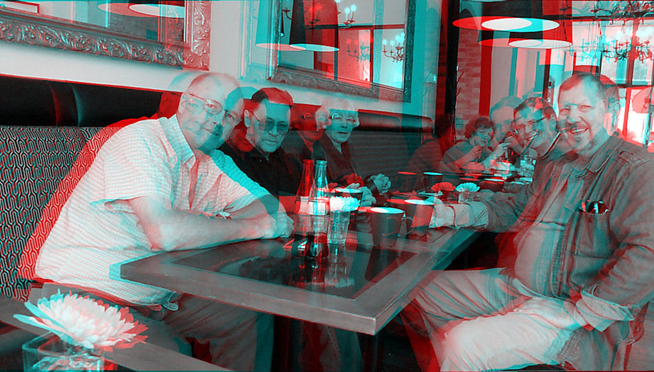 The FZ150, despite having only one lens, can take 3D photos as well. You put it in 3D mode and, after pressing the shutter release, slowly move the camera from left to right over the course of about four seconds. During this time the camera will take about a dozen photos, then it will analyze them and select the two which should make the best stereo pair. The photo above was taken using this method and it turned out pretty well. All the Klatschers held still, as is required for this technique to work properly, but if you look in the background the lady at the next table was moving a little so she looks a bit odd. None of our group looks even the slightest bit odd, though. Nope, not us. |