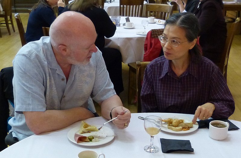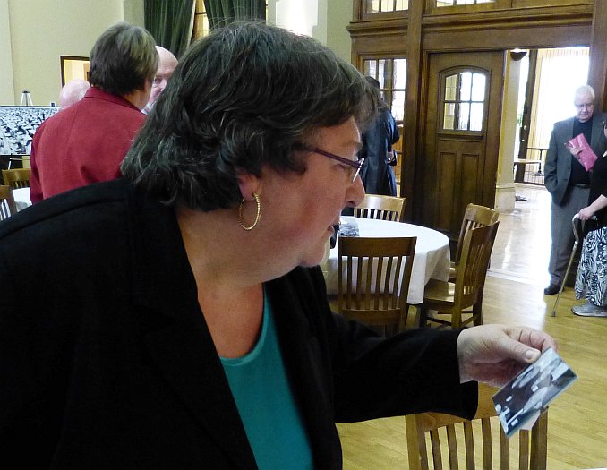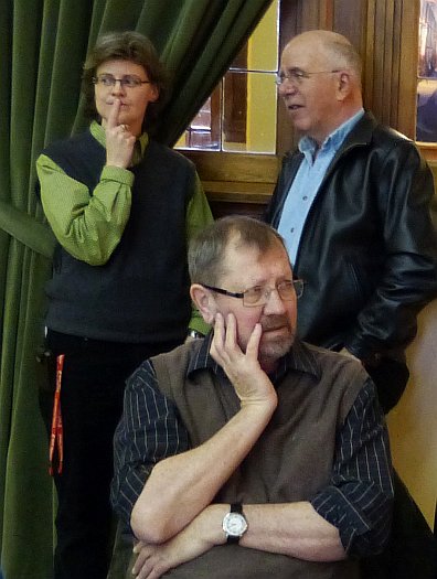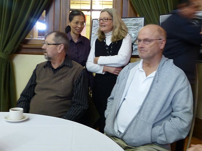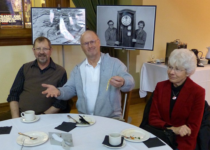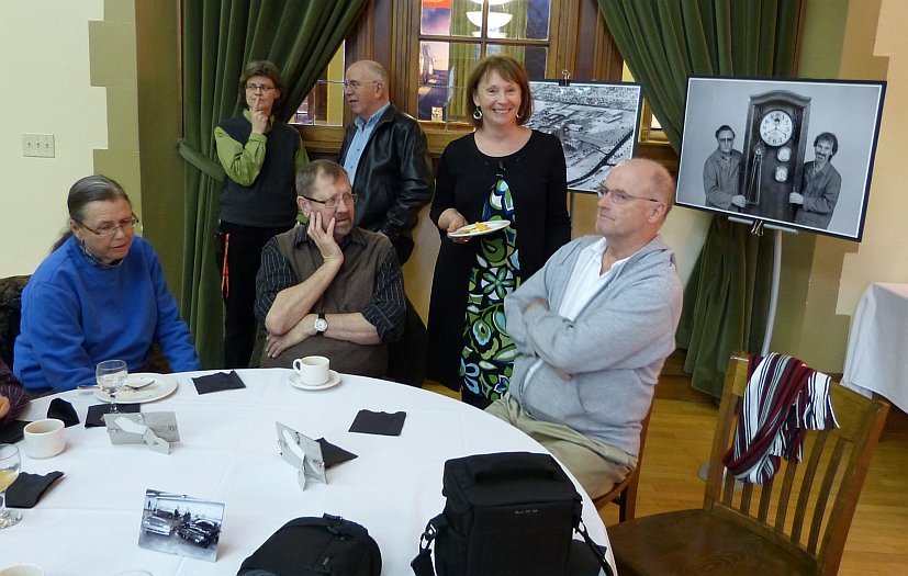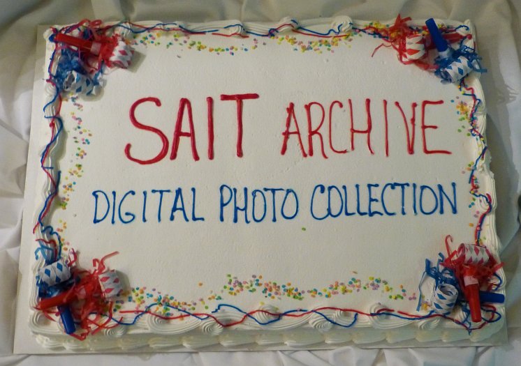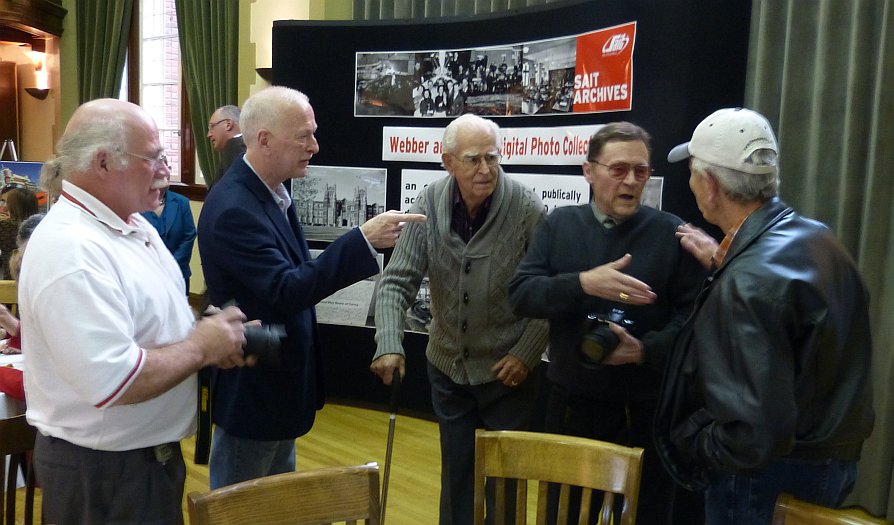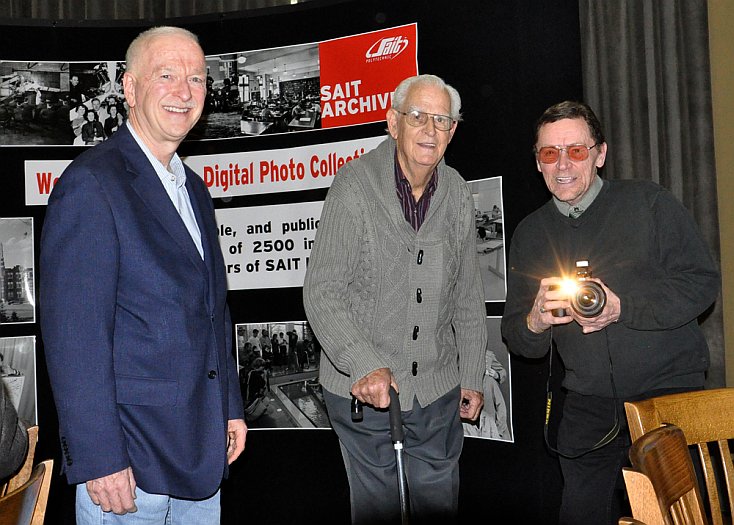 Three SAIT photogs, one non-SAIT photo. This week's Klatsch coincided with the launch of a Web site featuring photos taken by Ron Burton and George Webber while they were in indentured servitude at the Tech. The original SAIT photographer, Don MacKenzie, came out to the event to help them celebrate. Here they are together with Ronald demonstrating that he's still pretty quick on the draw. If you'd like to take a gander at the SAIT Archive Web site, go here