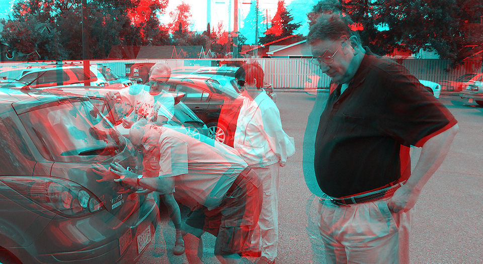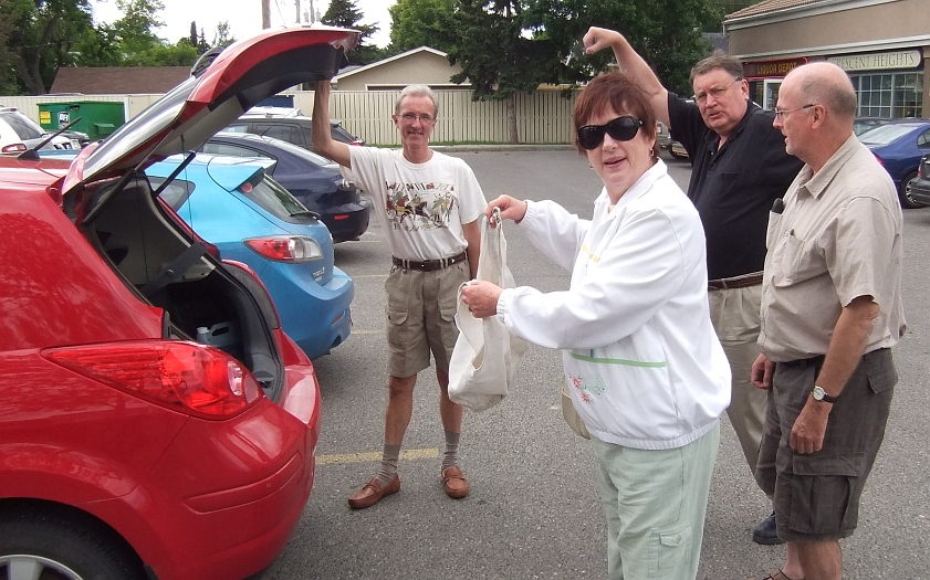 A very nice and very productive afternoon at the Joshua Tree. The previous week the idiot KlatschMeister closed his trunk lid down on a cloth shopping bag and found, to his horror, that he could not get the lid up again. Not being the sort to suffer in silence, he proceeded to wail and moan about this tiny bit of inconvenience at the Klatsch. The others in attendance, probably just to shut him up, volunteered to try to get the trunk lid open. After a certain amount of fussing and fuming and, it must be said, posturing, Big Walt (seen here flexing his not inconsiderable muscles) put the pedal to the metal and hoisted the damn thing open with a mighty tug. Thnax, W. I am eternally grateful. The offending bag is seen in the forground being held up by Ginger.