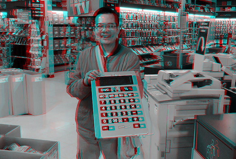 At Staples to drop off some electronics in the recycle bins, Alvin spotted this tiny little calculator. Sheesh. Who could use a thing like that?