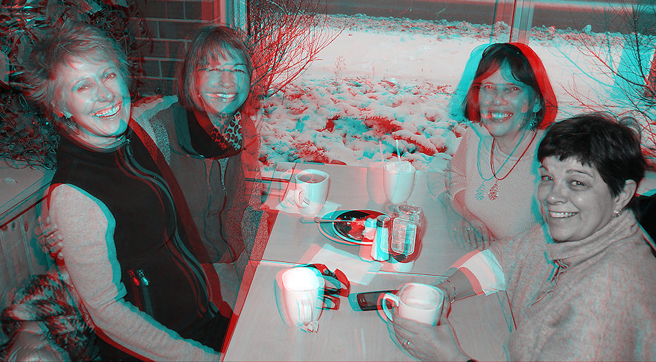 It's mid-January and The Klatsch has descended upon the Extreme Bean Cafe for a cuppa. And who should we run into there but Joan Birkett and some of her pals who were there for exactly the same reason! Must be cosmic convergence -- and I wouldn't be surprised if sub-space field harmonics are not involved in some way as well. Great to see you, ladies, and thnax for letting me take your picture! |