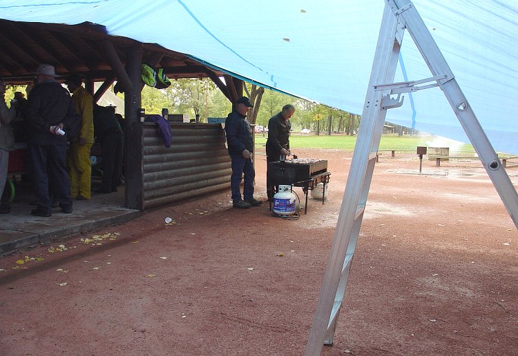 A dry veranda to the shelter was ingeniously created using a ladder, some rope and a blue tarp.