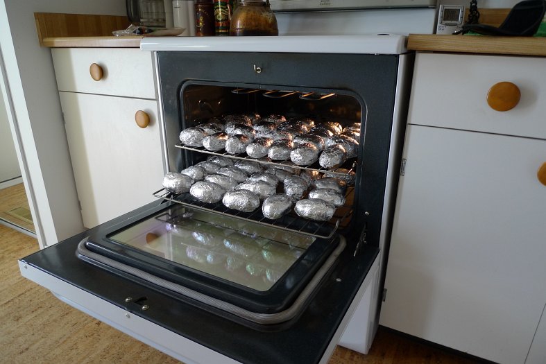 A few hours to go before the historic Spring 2009 Edition of the SAIT's Alive BBQ gets under way and the Mayor's new (to him) stove that he got from the Vieiras is stuffed to the gunnels with mmm, mmm, tasty spuds. By six o'clock all of these mmm, mmm, tasty spuds will have slid down the gullets of hungry retirees. Kinda gives you the creeps, doesn't it? |