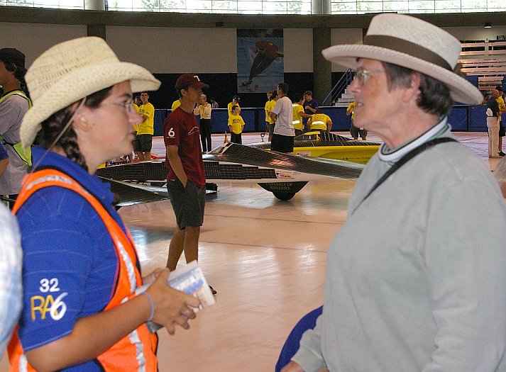 Mary having a chinwag with a member of the Principia University team. Principia is a liberal arts school with no engineering faculty but they figured, what the hell, let's make a solar car -- and they did.