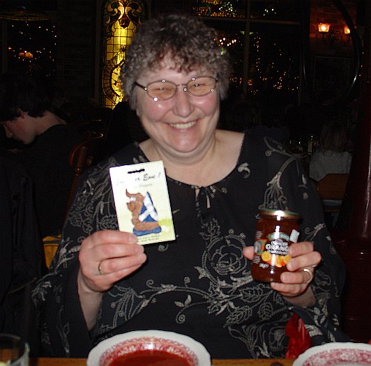 Unfortunately this pic of Sheil came out a little fuzzy, so I'm not exactly sure what she got. Looks like marmalade and a package of seeds, but maybe not.