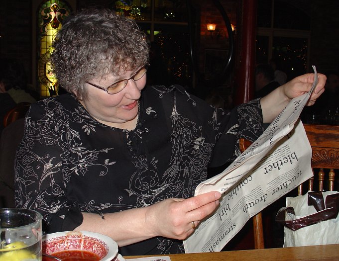 The Mayor's other prezzy was a lovely tea towel with Scottish definitions. Here's Sheil double-checking the definition of a skiver.