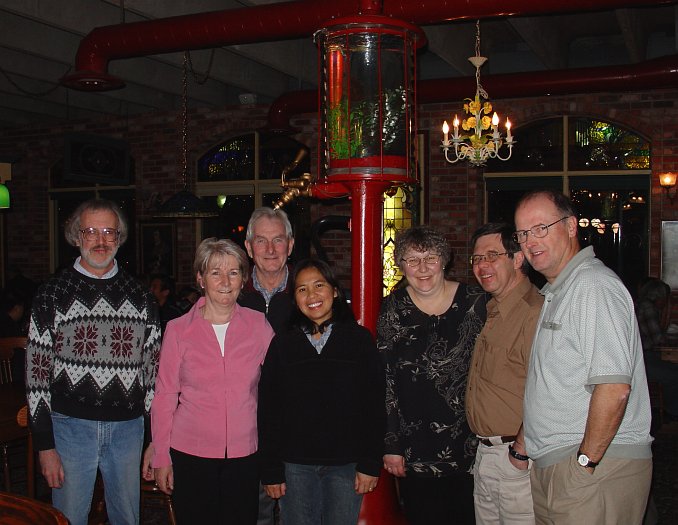 Here's the whole group posing in front of an old-time gas pump which had been converted into an aquarium. The tank had everything -- water, plants, gravel and air pump -- but no fish. Maybe they ended up in somebody's seafood futtucine.