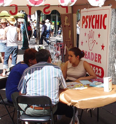 The man in the center is saying: I got an e-mail the other day which asked the rhetorical question "Why do we never see newspaper headlines which say "Psychic Wins Lottery"? The woman on the right is saying: Uuuuhhhh.