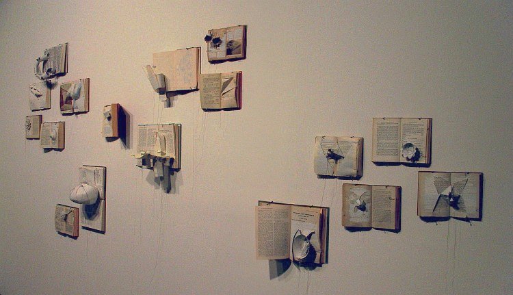 We headed downstairs to the Truck Gallery, which neither of us had been to before. Truck was showing three installation works by Vanessa Eidse. This is part of one of them. It's called Lessons for Beginners and, according to the Truck Web site is "a series of bookworks mounted to the wall suggesting the spaces we discover ourselves falling through and hinting at the forces pushing against us." |