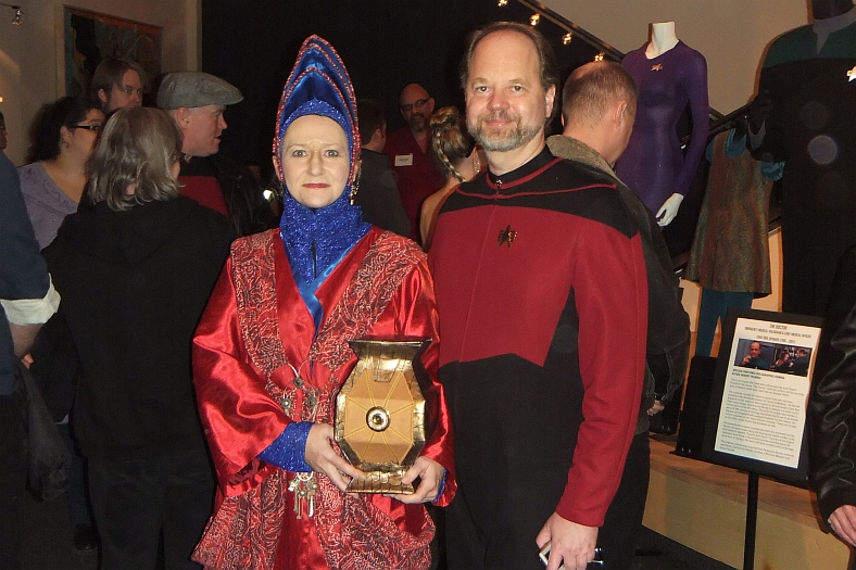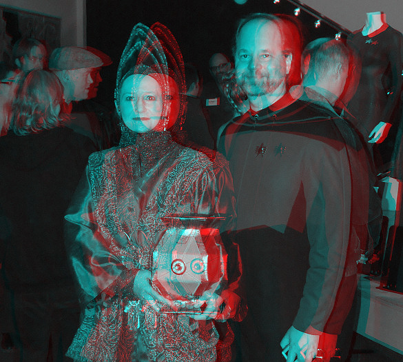 Here she is again with her Star Fleet escort. Unfortunately gray-scale anaglyphs do not do the outfit justice, so here's a look at it in color...