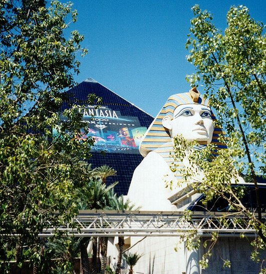 View of the Luxor from Las Vegas Boulevard showing the pyramid behind the Sphynx. Digby, who goes to Vegas much more frequently than the Mayor, hates the recently-added tram line which cuts across the front of the Luxor complex. He considers it an intolerable eyesore; a bonehead move which is an affront to civilized, sensitive people everywhere. The Mayor has to agree with him on this one. They should have put the damn thing somewhere out of sight. |
