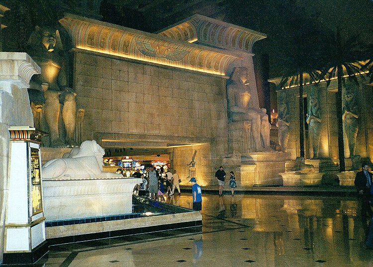 Mammoth foyer and entranceway to the Luxor casino, inside the pyramid. A giant escalator just out of sight on the left takes you up approximately four storeys to an exhibition and shopping level.