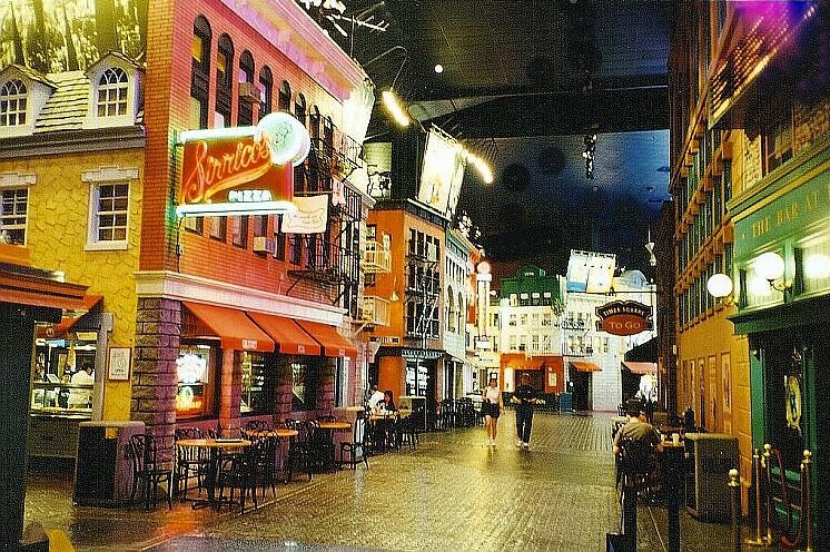 Surrounding the casino area, and extending into it in some places, are reproductions of the sidewalks of New York. The buildings come complete with fire escapes, air conditioners and flashing neon signs. The last time Digby was here, he said there was steam coming up out of Con Edison style manhole covers. Didn't see it this time, though. Maybe they're on strike. |