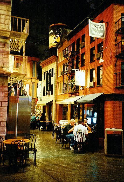Around a corner there's a sidewalk cafe just like the ones down in Little Italy. Hey, you in the black shirt. Wave at the camera willyuh?