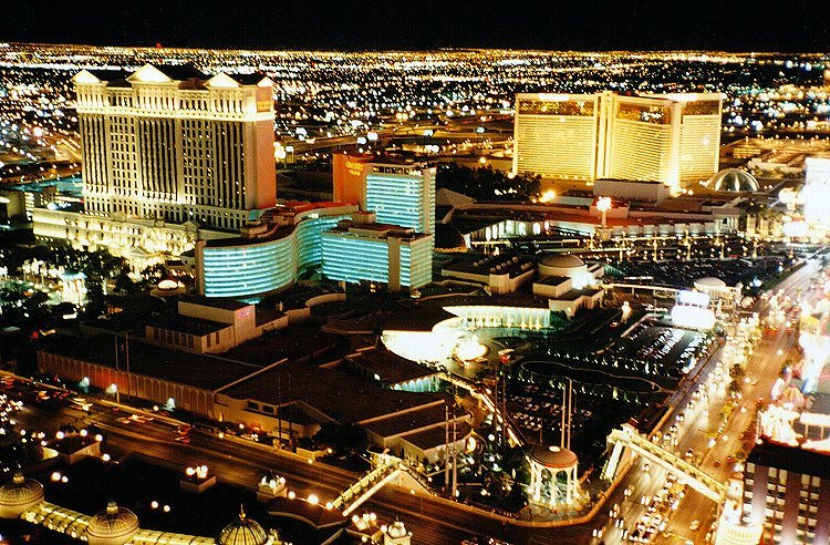 One of the views from the top of the Eiffel Tower. That's the Caesar's Palace Hotel on the left. The Mirage is to the right and that's Las Vegas Boulevard in the lower right.